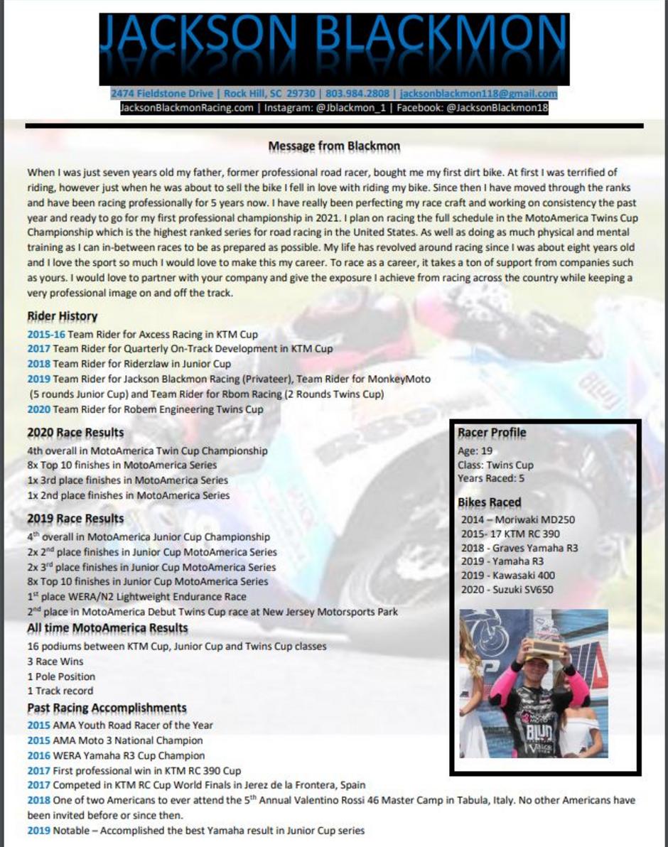 2474 Fieldstone Drive | Rock Hill, SC 29730 | 803-984-2808 | 18@JacksonBlackmonRacing.com